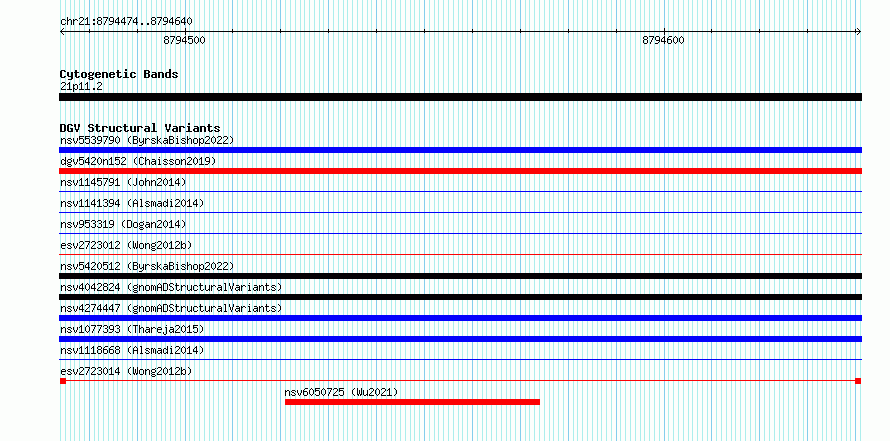 Variant DetailsVariant: essv6946327| Internal ID | 10050176 | | Landmark | | | Location Information | | | Cytoband | 21p11.2 | | Allele length | | Assembly | Allele length | | hg38 | 167 | | hg19 | 167 |