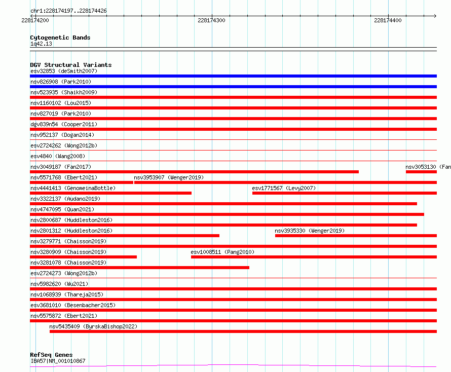 Variant DetailsVariant: essv6946664| Internal ID | 10057309 | | Landmark | | | Location Information | | | Cytoband | 1q42.13 | | Allele length | | Assembly | Allele length | | hg38 | 230 | | hg19 | 230 |