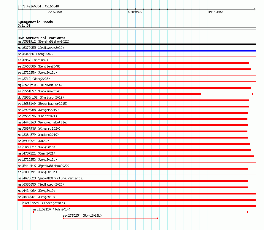 Variant DetailsVariant: essv6947065| Internal ID | 10056949 | | Landmark | | | Location Information | | | Cytoband | 3p21.31 | | Allele length | | Assembly | Allele length | | hg38 | 295 | | hg19 | 295 |