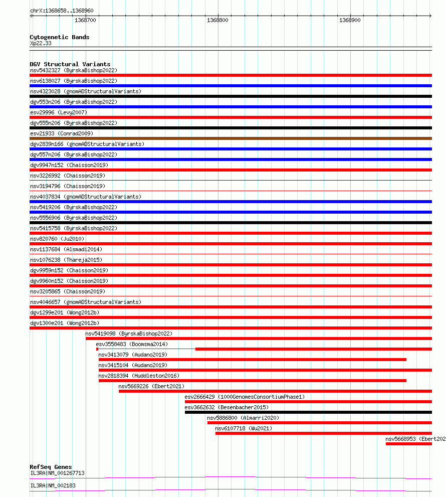Variant DetailsVariant: essv6948291| Internal ID | 10055845 | | Landmark | | | Location Information | | | Cytoband | Xp22.33 | | Allele length | | Assembly | Allele length | | hg38 | 303 | | hg19 | 303 |