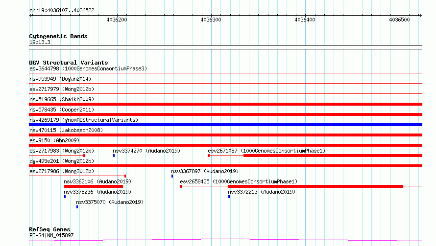 Variant DetailsVariant: essv6950136| Internal ID | 9707498 | | Landmark | | | Location Information | | | Cytoband | 19p13.3 | | Allele length | | Assembly | Allele length | | hg38 | 416 | | hg19 | 416 |