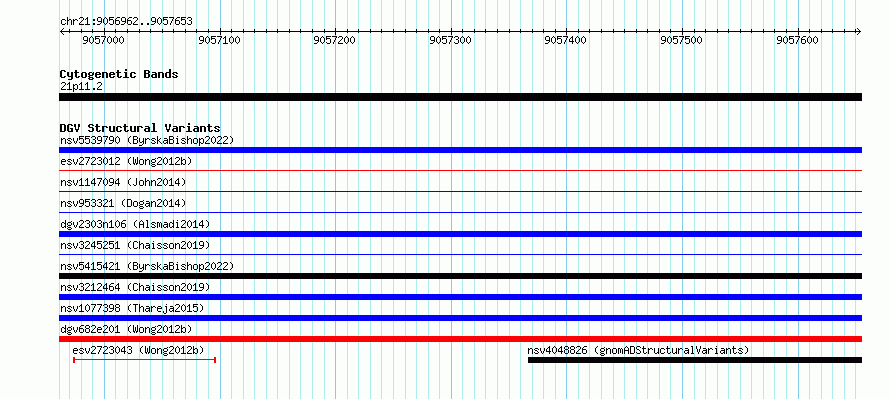 Variant DetailsVariant: essv6950388| Internal ID | 10053959 | | Landmark | | | Location Information | | | Cytoband | 21p11.2 | | Allele length | | Assembly | Allele length | | hg38 | 692 | | hg19 | 692 |