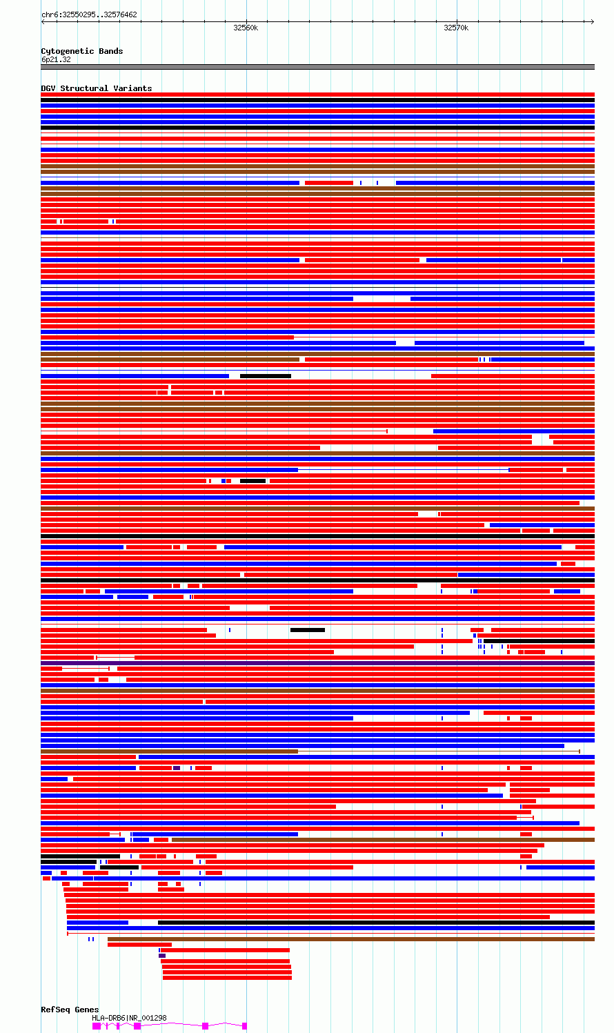 Variant DetailsVariant: essv6951867| Internal ID | 10059086 | | Landmark | | | Location Information | | | Cytoband | 6p21.32 | | Allele length | | Assembly | Allele length | | hg38 | 26168 | | hg19 | 26168 |