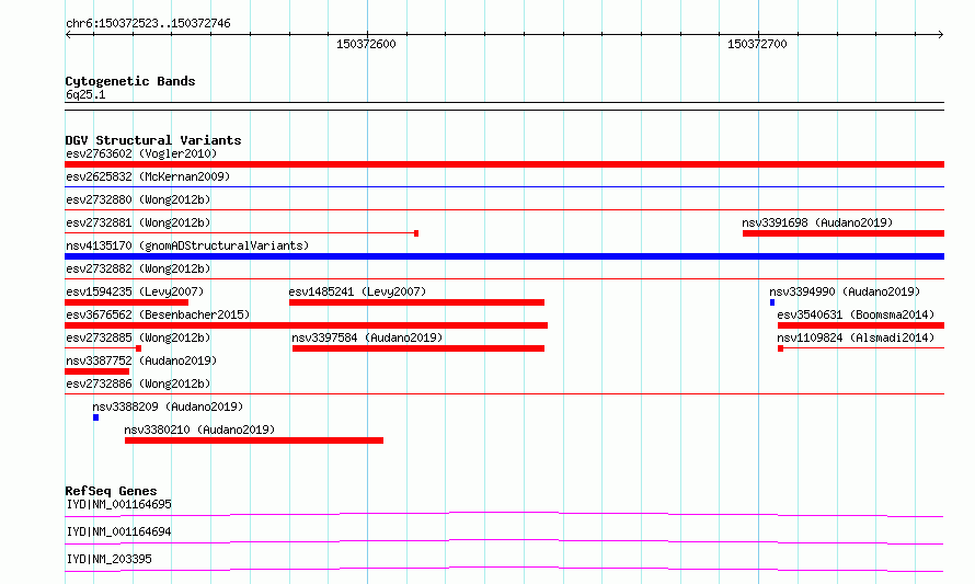 | Variant Type | CNV deletion | Copy Number | | Allele State | | Allele Origin | | Probe Count | | Validation Flag | | Merged Status | S | Merged Variants | esv2732880, esv2732886 | Supporting Variants | | Samples | SSM025 | Known Genes | IYD | Method | Sequencing | Analysis | Breakdancer:4 times standard deviation,VariationHunter:4 times standard deviation and at least 3 supportting reads | Platform | Illumina HiSeq 2000 | Comments | | Reference | Wong_et_al_2012b | Pubmed ID | 23290073 | Accession Number(s) | essv6952013
