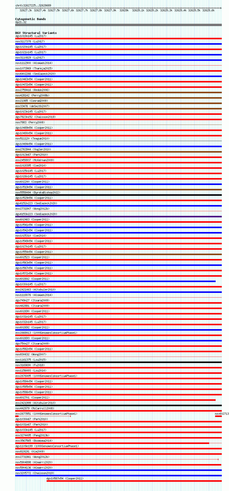 Variant DetailsVariant: essv6952706| Internal ID | 9982470 | | Landmark | | | Location Information | | | Cytoband | 6p21.32 | | Allele length | | Assembly | Allele length | | hg38 | 1465 | | hg19 | 1465 |