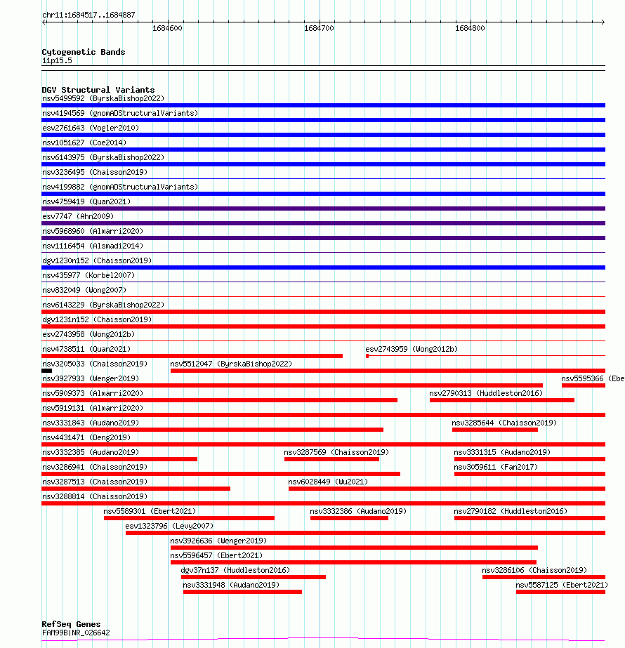 Variant DetailsVariant: essv6953027| Internal ID | 10057523 | | Landmark | | | Location Information | | | Cytoband | 11p15.5 | | Allele length | | Assembly | Allele length | | hg38 | 371 | | hg19 | 371 |
