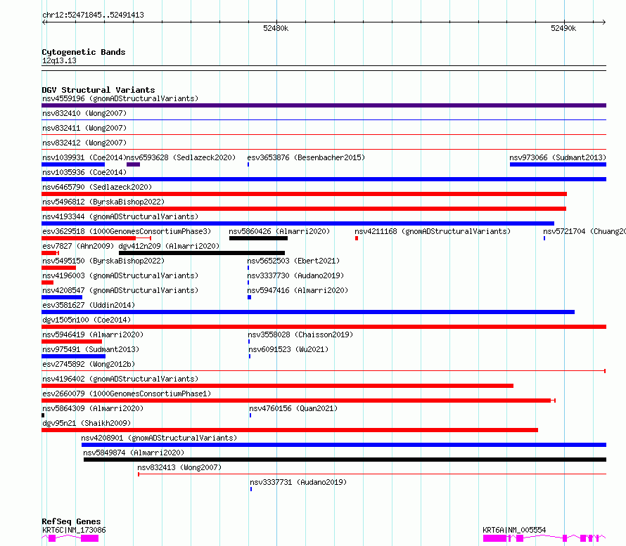 Variant DetailsVariant: essv6953247| Internal ID | 10057721 | | Landmark | | | Location Information | | | Cytoband | 12q13.13 | | Allele length | | Assembly | Allele length | | hg38 | 19569 | | hg19 | 19569 |