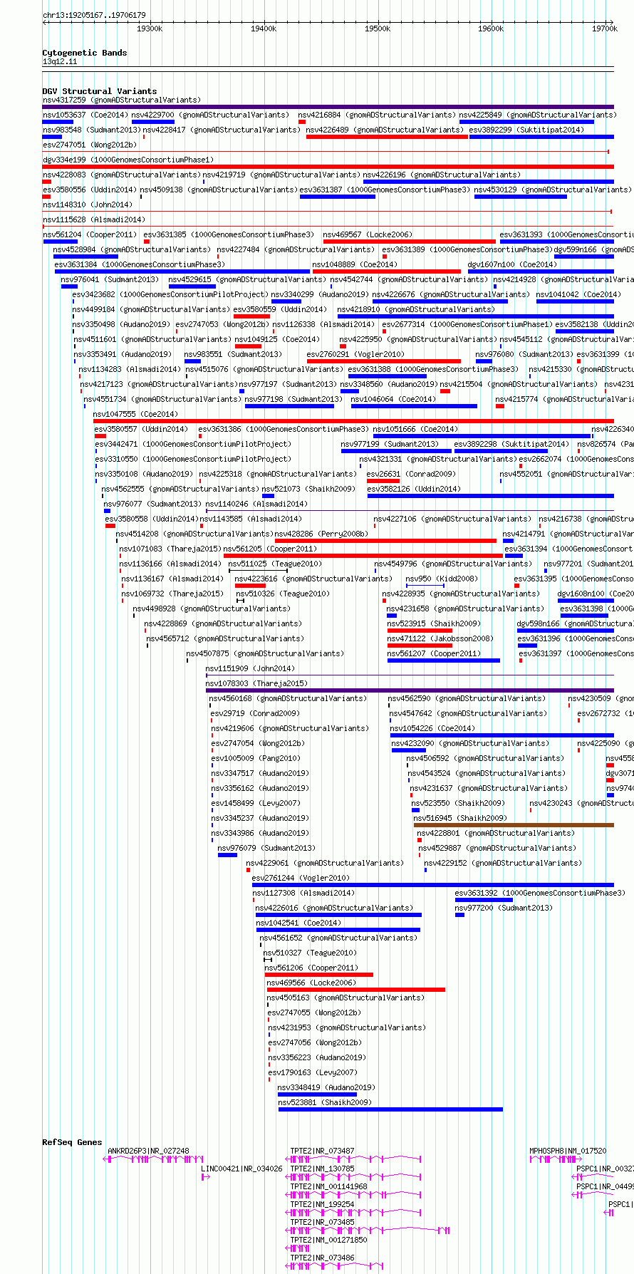 Variant DetailsVariant: essv6953348| Internal ID | 9711126 | | Landmark | | | Location Information | | | Cytoband | 13q12.11 | | Allele length | | Assembly | Allele length | | hg38 | 501013 | | hg19 | 501013 |