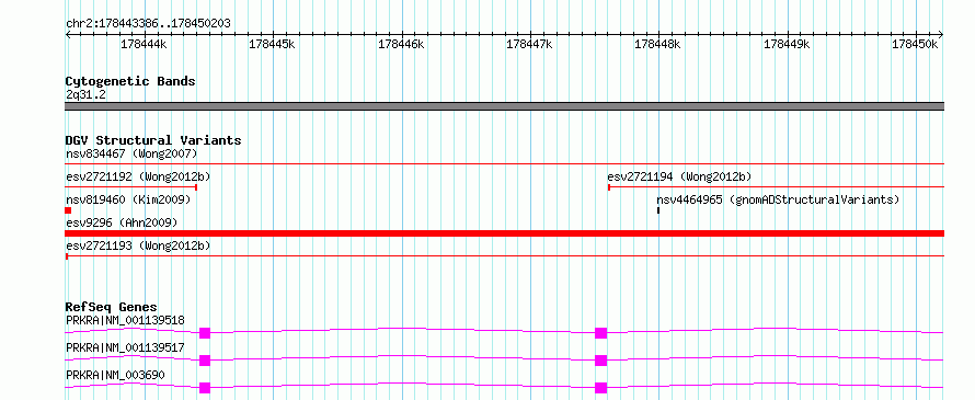 | | Variant Type | CNV deletion | | Copy Number | | | Allele State | | | Allele Origin | | | Probe Count | | | Validation Flag | | | Merged Status | S | | Merged Variants | esv2721193 | | Supporting Variants | | | Samples | SSM004 | | Known Genes | MIR548N, PRKRA | | Method | Sequencing | | Analysis | Breakdancer:4 times standard deviation,VariationHunter:4 times standard deviation and at least 3 supportting reads | | Platform | Illumina HiSeq 2000 | | Comments | | | Reference | Wong_et_al_2012b | | Pubmed ID | 23290073 | | Accession Number(s) | essv6953651