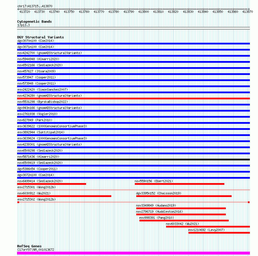 Variant DetailsVariant: essv6953922| Internal ID | 10058328 | | Landmark | | | Location Information | | | Cytoband | 17p13.3 | | Allele length | | Assembly | Allele length | | hg38 | 156 | | hg19 | 156 |