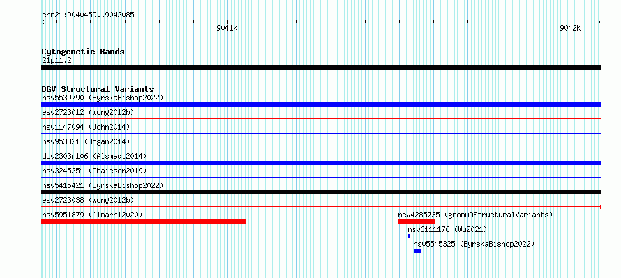Variant DetailsVariant: essv6954551| Internal ID | 10058894 | | Landmark | | | Location Information | | | Cytoband | 21p11.2 | | Allele length | | Assembly | Allele length | | hg38 | 1627 | | hg19 | 1627 |