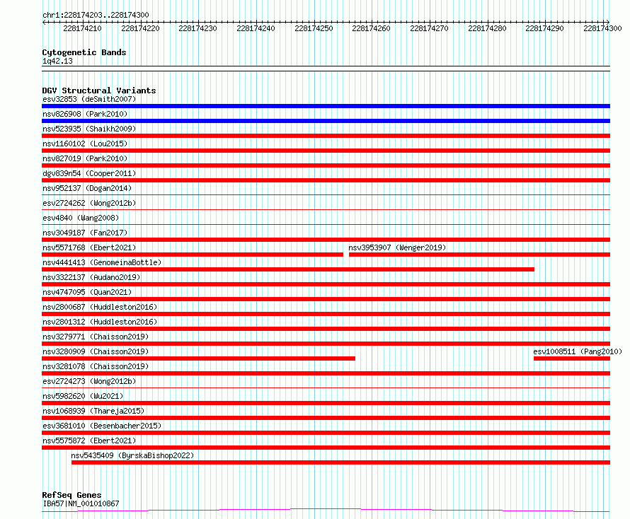 Variant DetailsVariant: essv6955032| Internal ID | 10063901 | | Landmark | | | Location Information | | | Cytoband | 1q42.13 | | Allele length | | Assembly | Allele length | | hg38 | 98 | | hg19 | 98 |