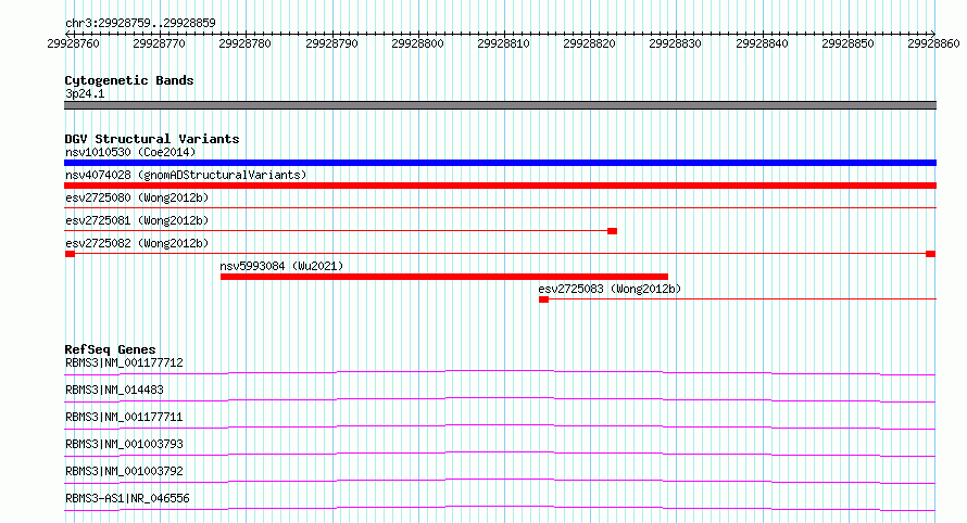 | | Variant Type | CNV deletion | | Copy Number | | | Allele State | | | Allele Origin | | | Probe Count | | | Validation Flag | | | Merged Status | S | | Merged Variants | esv2725082, esv2725080 | | Supporting Variants | | | Samples | SSM026 | | Known Genes | RBMS3 | | Method | Sequencing | | Analysis | Breakdancer:4 times standard deviation,VariationHunter:4 times standard deviation and at least 3 supportting reads | | Platform | Illumina HiSeq 2000 | | Comments | | | Reference | Wong_et_al_2012b | | Pubmed ID | 23290073 | | Accession Number(s) | essv6955674