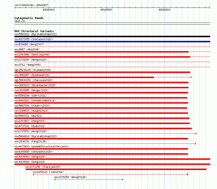 Variant DetailsVariant: essv6955714| Internal ID | 10064513 | | Landmark | | | Location Information | | | Cytoband | 3p21.31 | | Allele length | | Assembly | Allele length | | hg38 | 337 | | hg19 | 337 |