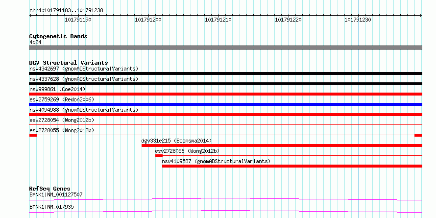 | Variant Type | CNV deletion | Copy Number | | Allele State | | Allele Origin | | Probe Count | | Validation Flag | | Merged Status | S | Merged Variants | esv2728055, esv2728054 | Supporting Variants | | Samples | SSM026 | Known Genes | BANK1 | Method | Sequencing | Analysis | Breakdancer:4 times standard deviation,VariationHunter:4 times standard deviation and at least 3 supportting reads | Platform | Illumina HiSeq 2000 | Comments | | Reference | Wong_et_al_2012b | Pubmed ID | 23290073 | Accession Number(s) | essv6956238