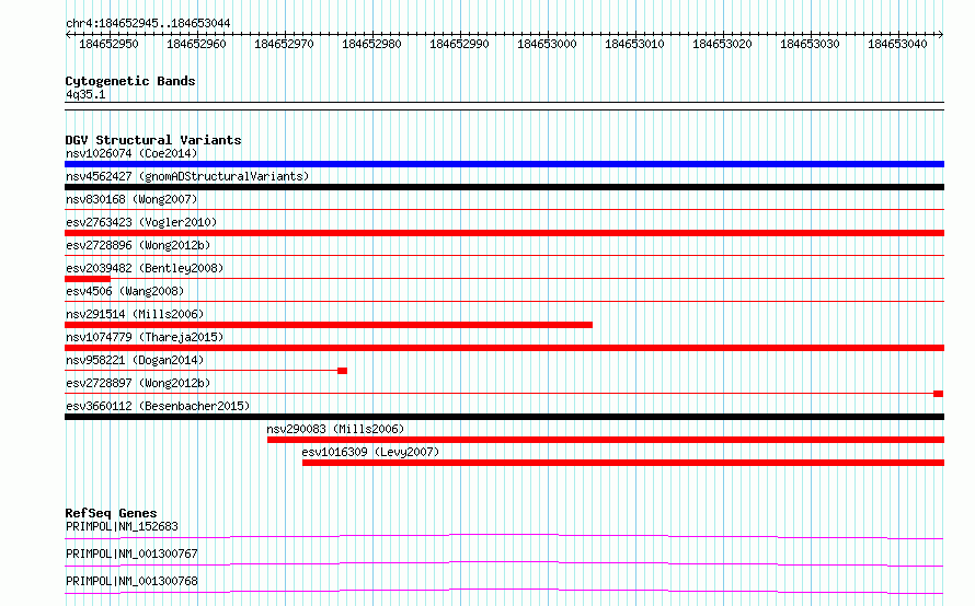 | | Variant Type | CNV deletion | | Copy Number | | | Allele State | | | Allele Origin | | | Probe Count | | | Validation Flag | | | Merged Status | S | | Merged Variants | esv2728896, esv2728897 | | Supporting Variants | | | Samples | SSM026 | | Known Genes | PRIMPOL | | Method | Sequencing | | Analysis | Breakdancer:4 times standard deviation,VariationHunter:4 times standard deviation and at least 3 supportting reads | | Platform | Illumina HiSeq 2000 | | Comments | | | Reference | Wong_et_al_2012b | | Pubmed ID | 23290073 | | Accession Number(s) | essv6956399