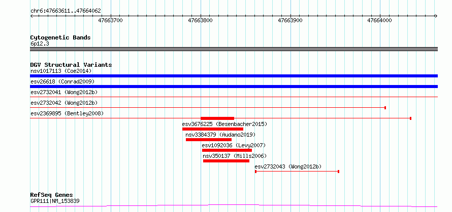 | | Variant Type | CNV deletion | | Copy Number | | | Allele State | | | Allele Origin | | | Probe Count | | | Validation Flag | | | Merged Status | S | | Merged Variants | esv2732042, esv2732041 | | Supporting Variants | | | Samples | SSM026 | | Known Genes | GPR111 | | Method | Sequencing | | Analysis | Breakdancer:4 times standard deviation,VariationHunter:4 times standard deviation and at least 3 supportting reads | | Platform | Illumina HiSeq 2000 | | Comments | | | Reference | Wong_et_al_2012b | | Pubmed ID | 23290073 | | Accession Number(s) | essv6957028