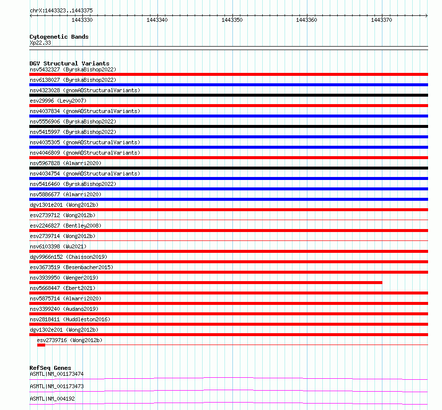 Variant DetailsVariant: essv6957788| Internal ID | 10066381 | | Landmark | | | Location Information | | | Cytoband | Xp22.33 | | Allele length | | Assembly | Allele length | | hg38 | 53 | | hg19 | 53 |
