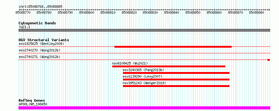 Variant DetailsVariant: essv6957894| Internal ID | 10066477 | | Landmark | | | Location Information | | | Cytoband | Xq21.1 | | Allele length | | Assembly | Allele length | | hg38 | 118 | | hg19 | 118 |