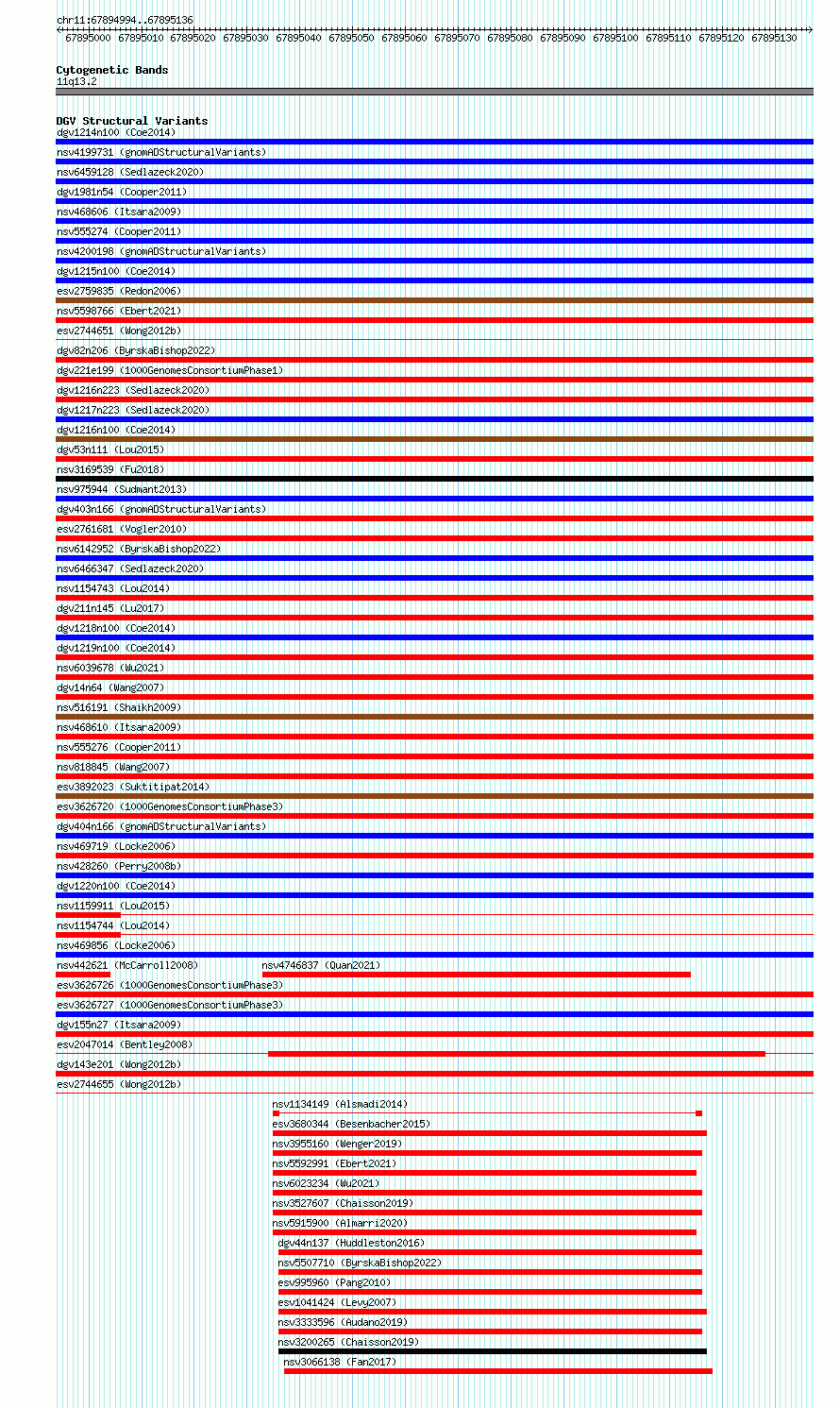 Variant DetailsVariant: essv6959092| Internal ID | 10061524 | | Landmark | | | Location Information | | | Cytoband | 11q13.2 | | Allele length | | Assembly | Allele length | | hg38 | 143 | | hg19 | 143 |