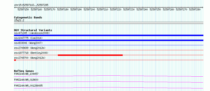 | | Variant Type | CNV deletion | | Copy Number | | | Allele State | | | Allele Origin | | | Probe Count | | | Validation Flag | | | Merged Status | S | | Merged Variants | esv2749700, esv2749699 | | Supporting Variants | | | Samples | SSM026 | | Known Genes | FAM214A | | Method | Sequencing | | Analysis | Breakdancer:4 times standard deviation,VariationHunter:4 times standard deviation and at least 3 supportting reads | | Platform | Illumina HiSeq 2000 | | Comments | | | Reference | Wong_et_al_2012b | | Pubmed ID | 23290073 | | Accession Number(s) | essv6959958