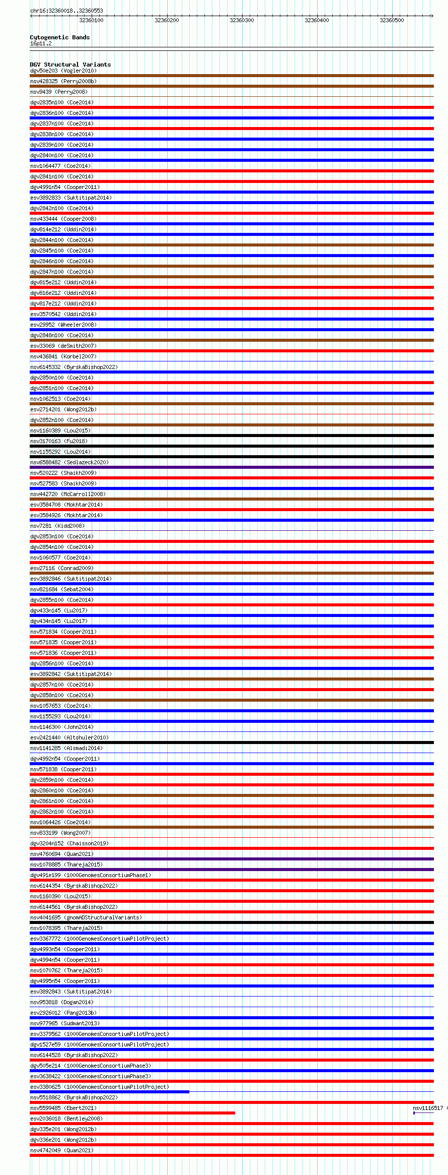 Variant DetailsVariant: essv6960137| Internal ID | 10062466 | | Landmark | | | Location Information | | | Cytoband | 16p11.2 | | Allele length | | Assembly | Allele length | | hg38 | 536 | | hg19 | 536 |