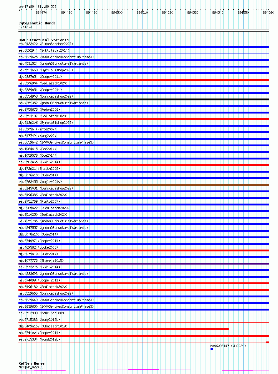 Variant DetailsVariant: essv6960349| Internal ID | 10062656 | | Landmark | | | Location Information | | | Cytoband | 17p13.3 | | Allele length | | Assembly | Allele length | | hg38 | 99 | | hg19 | 99 |