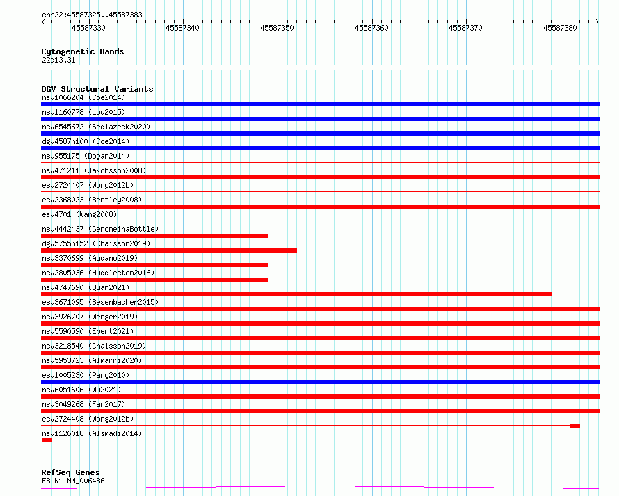 Variant DetailsVariant: essv6961219| Internal ID | 10063439 | | Landmark | | | Location Information | | | Cytoband | 22q13.31 | | Allele length | | Assembly | Allele length | | hg38 | 59 | | hg19 | 59 |