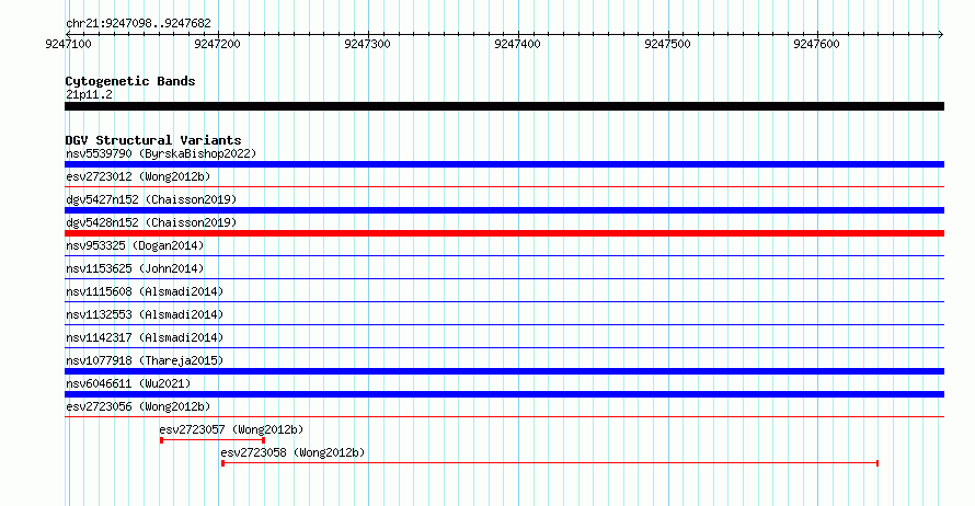 Variant DetailsVariant: essv6961288| Internal ID | 10063500 | | Landmark | | | Location Information | | | Cytoband | 21p11.2 | | Allele length | | Assembly | Allele length | | hg38 | 585 | | hg19 | 585 |