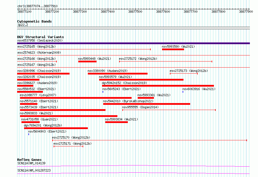 | | Variant Type | CNV deletion | | Copy Number | | | Allele State | | | Allele Origin | | | Probe Count | | | Validation Flag | | | Merged Status | S | | Merged Variants | esv2725165, esv2725167 | | Supporting Variants | | | Samples | SSM027 | | Known Genes | SCN11A | | Method | Sequencing | | Analysis | Breakdancer:4 times standard deviation,VariationHunter:4 times standard deviation and at least 3 supportting reads | | Platform | Illumina HiSeq 2000 | | Comments | | | Reference | Wong_et_al_2012b | | Pubmed ID | 23290073 | | Accession Number(s) | essv6962436