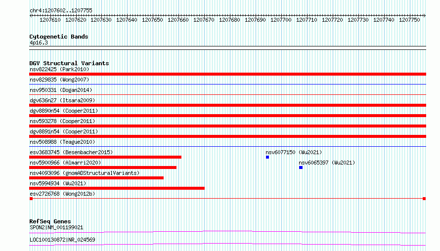 | | Variant Type | CNV deletion | | Copy Number | | | Allele State | | | Allele Origin | | | Probe Count | | | Validation Flag | | | Merged Status | S | | Merged Variants | esv2726768 | | Supporting Variants | | | Samples | SSM027 | | Known Genes | LOC100130872, SPON2 | | Method | Sequencing | | Analysis | Breakdancer:4 times standard deviation,VariationHunter:4 times standard deviation and at least 3 supportting reads | | Platform | Illumina HiSeq 2000 | | Comments | | | Reference | Wong_et_al_2012b | | Pubmed ID | 23290073 | | Accession Number(s) | essv6962701