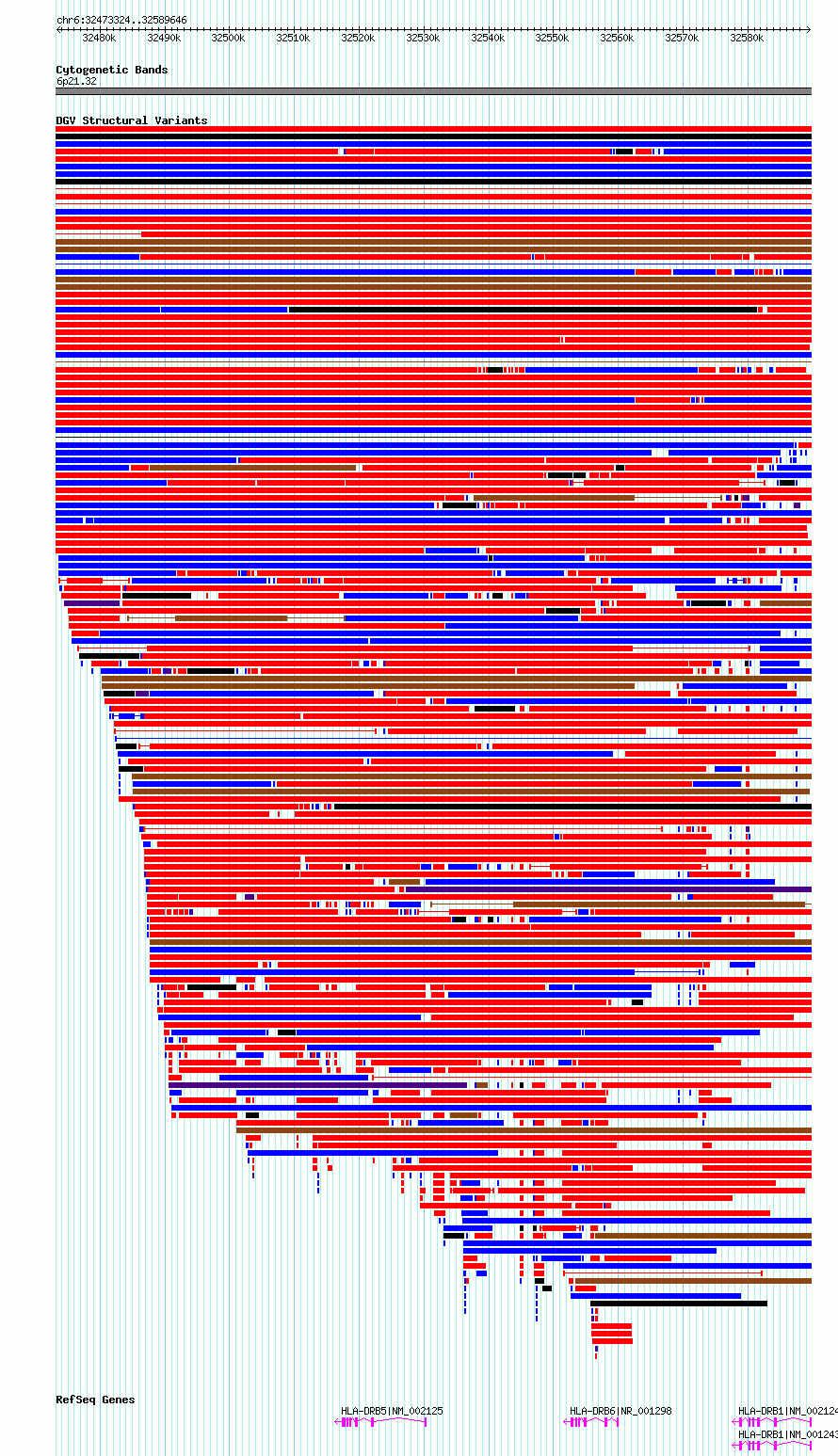 | | Variant Type | CNV deletion | | Copy Number | | | Allele State | | | Allele Origin | | | Probe Count | | | Validation Flag | | | Merged Status | S | | Merged Variants | esv2731844, esv2731839, esv2731842, esv2731835, esv2731837 | | Supporting Variants | | | Samples | SSM027 | | Known Genes | HLA-DRB1, HLA-DRB5, HLA-DRB6 | | Method | Sequencing | | Analysis | Breakdancer:4 times standard deviation,VariationHunter:4 times standard deviation and at least 3 supportting reads | | Platform | Illumina HiSeq 2000 | | Comments | | | Reference | Wong_et_al_2012b | | Pubmed ID | 23290073 | | Accession Number(s) | essv6963676