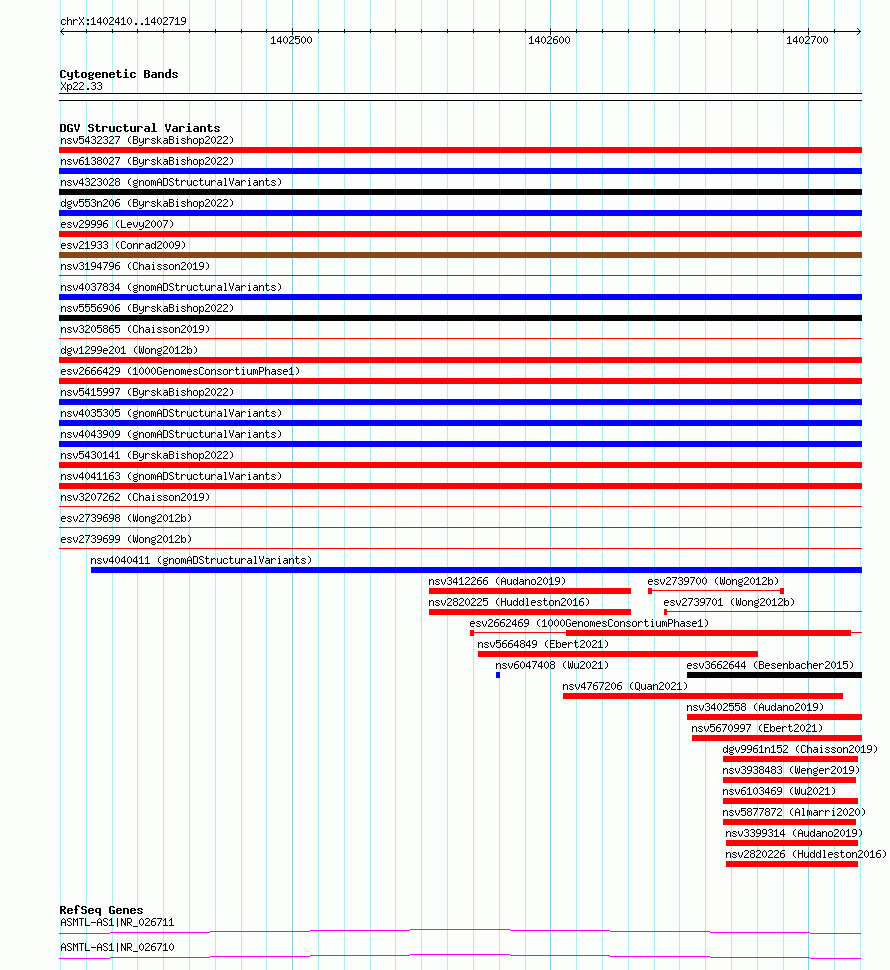 Variant DetailsVariant: essv6964487| Internal ID | 10071071 | | Landmark | | | Location Information | | | Cytoband | Xp22.33 | | Allele length | | Assembly | Allele length | | hg38 | 310 | | hg19 | 310 |