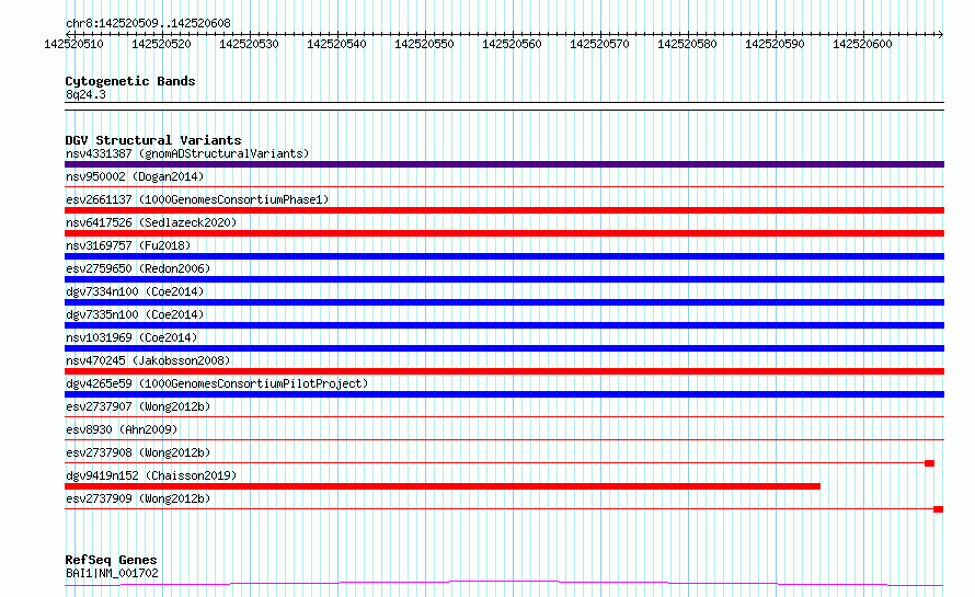 | | Variant Type | CNV deletion | | Copy Number | | | Allele State | | | Allele Origin | | | Probe Count | | | Validation Flag | | | Merged Status | S | | Merged Variants | esv2737909, esv2737907 | | Supporting Variants | | | Samples | SSM027 | | Known Genes | BAI1 | | Method | Sequencing | | Analysis | Breakdancer:4 times standard deviation,VariationHunter:4 times standard deviation and at least 3 supportting reads | | Platform | Illumina HiSeq 2000 | | Comments | | | Reference | Wong_et_al_2012b | | Pubmed ID | 23290073 | | Accession Number(s) | essv6964891
