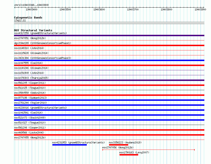 Variant DetailsVariant: essv6965980| Internal ID | 9723561 | | Landmark | | | Location Information | | | Cytoband | 13q12.11 | | Allele length | | Assembly | Allele length | | hg38 | 562 | | hg19 | 562 |