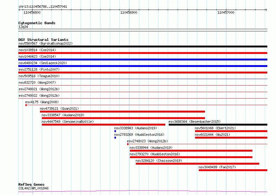 | | Variant Type | CNV deletion | | Copy Number | | | Allele State | | | Allele Origin | | | Probe Count | | | Validation Flag | | | Merged Status | S | | Merged Variants | esv2748022, esv2748021 | | Supporting Variants | | | Samples | SSM027 | | Known Genes | COL4A2 | | Method | Sequencing | | Analysis | Breakdancer:4 times standard deviation,VariationHunter:4 times standard deviation and at least 3 supportting reads | | Platform | Illumina HiSeq 2000 | | Comments | | | Reference | Wong_et_al_2012b | | Pubmed ID | 23290073 | | Accession Number(s) | essv6966149