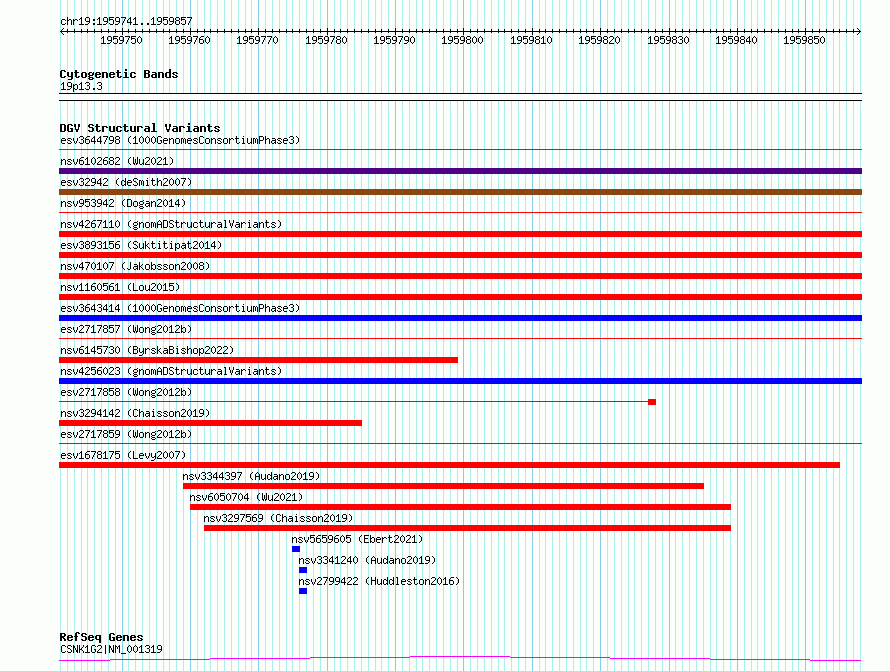 Variant DetailsVariant: essv6967390| Internal ID | 10071977 | | Landmark | | | Location Information | | | Cytoband | 19p13.3 | | Allele length | | Assembly | Allele length | | hg38 | 117 | | hg19 | 117 |