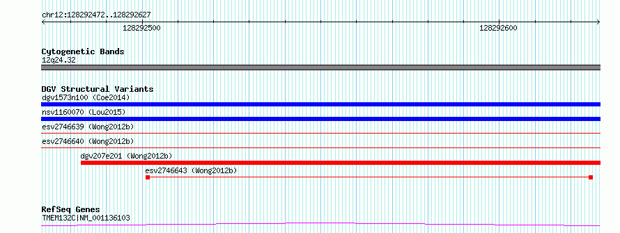 | | Variant Type | CNV deletion | | Copy Number | | | Allele State | | | Allele Origin | | | Probe Count | | | Validation Flag | | | Merged Status | S | | Merged Variants | esv2746639, esv2746640 | | Supporting Variants | | | Samples | SSM028 | | Known Genes | TMEM132C | | Method | Sequencing | | Analysis | Breakdancer:4 times standard deviation,VariationHunter:4 times standard deviation and at least 3 supportting reads | | Platform | Illumina HiSeq 2000 | | Comments | | | Reference | Wong_et_al_2012b | | Pubmed ID | 23290073 | | Accession Number(s) | essv6970898