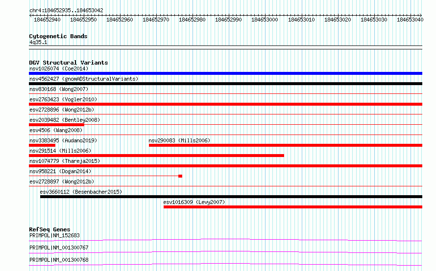 | | Variant Type | CNV deletion | | Copy Number | | | Allele State | | | Allele Origin | | | Probe Count | | | Validation Flag | | | Merged Status | S | | Merged Variants | esv2728896, esv2728897 | | Supporting Variants | | | Samples | SSM029 | | Known Genes | PRIMPOL | | Method | Sequencing | | Analysis | Breakdancer:4 times standard deviation,VariationHunter:4 times standard deviation and at least 3 supportting reads | | Platform | Illumina HiSeq 2000 | | Comments | | | Reference | Wong_et_al_2012b | | Pubmed ID | 23290073 | | Accession Number(s) | essv6974133