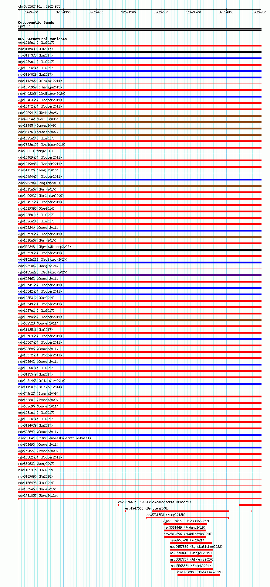 Variant DetailsVariant: essv6974755| Internal ID | 10083191 | | Landmark | | | Location Information | | | Cytoband | 6p21.32 | | Allele length | | Assembly | Allele length | | hg38 | 745 | | hg19 | 745 |