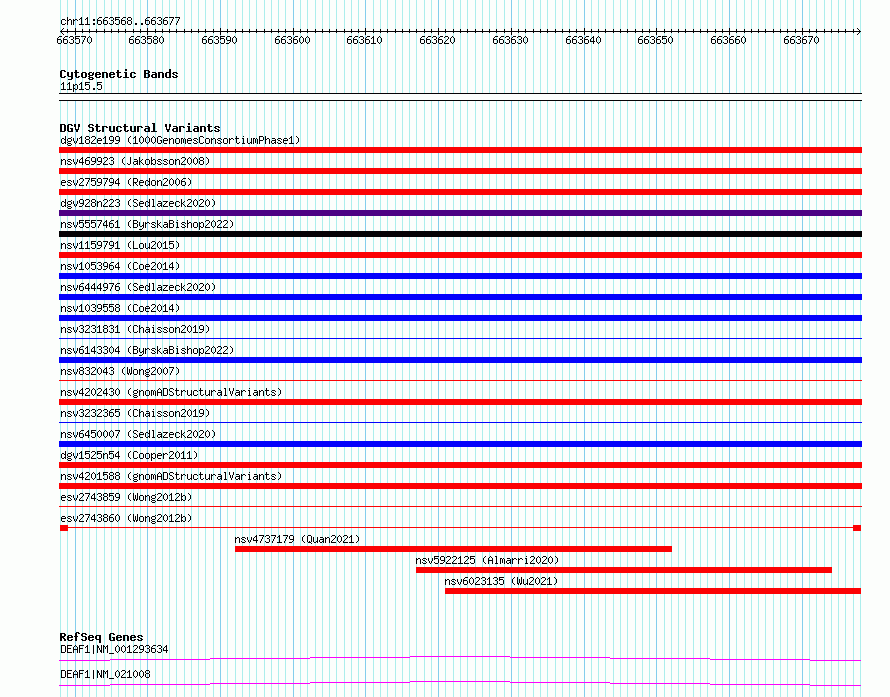Variant DetailsVariant: essv6976786| Internal ID | 10081362 | | Landmark | | | Location Information | | | Cytoband | 11p15.5 | | Allele length | | Assembly | Allele length | | hg38 | 110 | | hg19 | 110 |