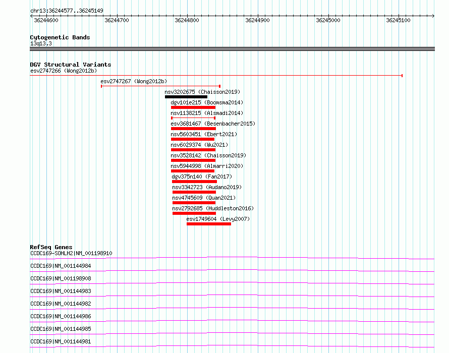 | | Variant Type | CNV deletion | | Copy Number | | | Allele State | | | Allele Origin | | | Probe Count | | | Validation Flag | | | Merged Status | S | | Merged Variants | esv2747266 | | Supporting Variants | | | Samples | SSM029 | | Known Genes | CCDC169, CCDC169-SOHLH2 | | Method | Sequencing | | Analysis | Breakdancer:4 times standard deviation,VariationHunter:4 times standard deviation and at least 3 supportting reads | | Platform | Illumina HiSeq 2000 | | Comments | | | Reference | Wong_et_al_2012b | | Pubmed ID | 23290073 | | Accession Number(s) | essv6977482