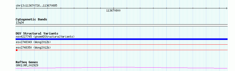 | Variant Type | CNV deletion | Copy Number | | Allele State | | Allele Origin | | Probe Count | | Validation Flag | | Merged Status | S | Merged Variants | esv2748350, esv2748349 | Supporting Variants | | Samples | SSM029 | Known Genes | GRK1 | Method | Sequencing | Analysis | Breakdancer:4 times standard deviation,VariationHunter:4 times standard deviation and at least 3 supportting reads | Platform | Illumina HiSeq 2000 | Comments | | Reference | Wong_et_al_2012b | Pubmed ID | 23290073 | Accession Number(s) | essv6977675