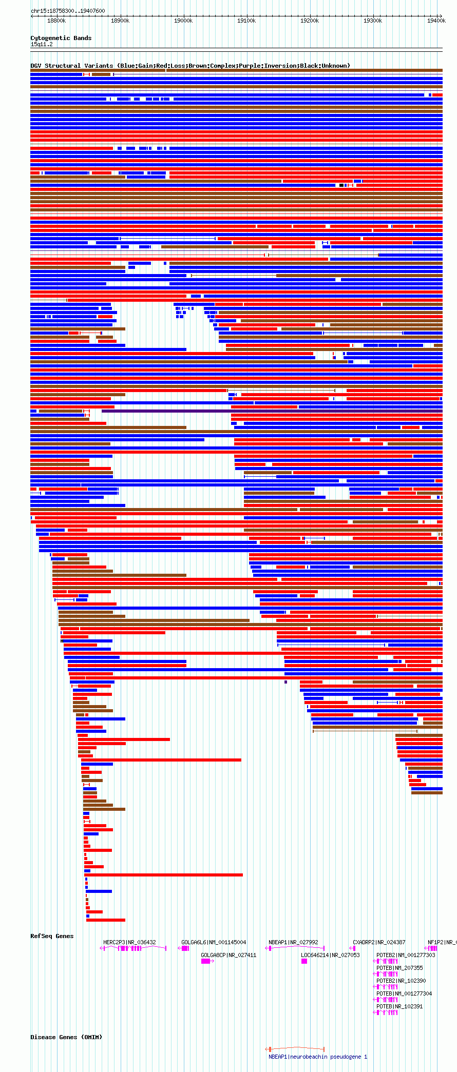 Variant DetailsVariant: essv6978073| Internal ID | 12978574 | | Landmark | | | Location Information | | | Cytoband | 15q11.1 | | Allele length | | Assembly | Allele length | | hg38 | 644580 | | hg19 | 644656 | | hg18 | 649301 | | hg17 | 649301 |