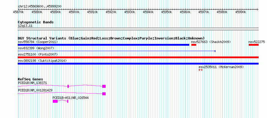 | Variant Type | CNV loss | Copy Number | | Allele State | | Allele Origin | | Probe Count | | Validation Flag | | Merged Status | S | Merged Variants | esv2751100 | Supporting Variants | | Samples | BEC_404 | Known Genes | PCED1B, PCED1B-AS1 | Method | SNP array | Analysis | | Platform | Affymetrix Mapping 250K Nsp SNP Array | Comments | | Reference | Pinto_et_al_2007 | Pubmed ID | 17911159 | Accession Number(s) | essv6982221