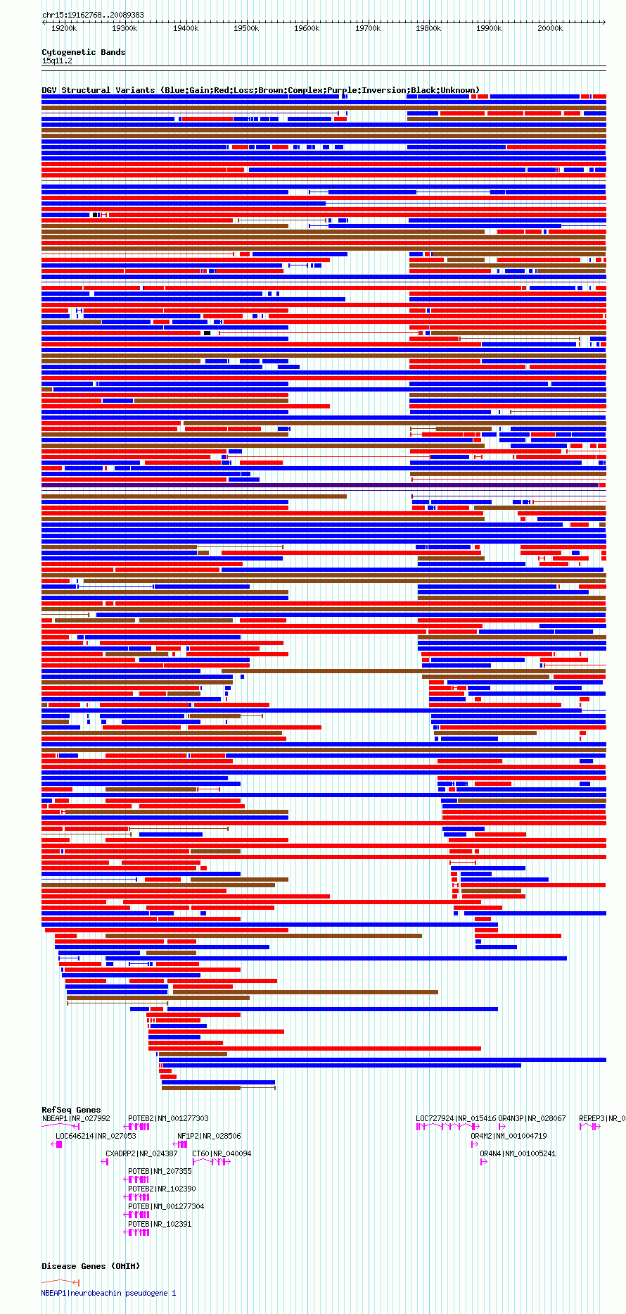 | | Variant Type | CNV loss | | Copy Number | | | Allele State | | | Allele Origin | | | Probe Count | | | Validation Flag | | | Merged Status | S | | Merged Variants | esv2751419 | | Supporting Variants | | | Samples | BEC_406 | | Known Genes | CT60, CXADRP2, LOC646214, LOC727924, NBEAP1, NF1P2, OR4M2, OR4N3P, OR4N4, POTEB, POTEB2, REREP3 | | Method | SNP array | | Analysis | | | Platform | Affymetrix Mapping 250K Nsp SNP Array | | Comments | | | Reference | Pinto_et_al_2007 | | Pubmed ID | 17911159 | | Accession Number(s) | essv6982250