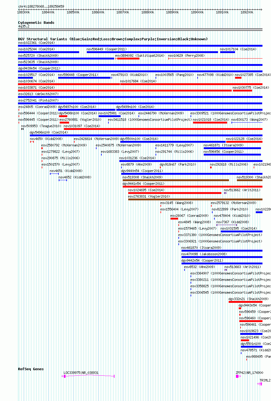 | Variant Type | CNV gain | Copy Number | | Allele State | | Allele Origin | | Probe Count | | Validation Flag | | Merged Status | S | Merged Variants | esv2752041 | Supporting Variants | | Samples | BEC_573 | Known Genes | LOC339975, TRIML2, ZFP42 | Method | SNP array | Analysis | | Platform | Affymetrix Mapping 250K Nsp SNP Array | Comments | | Reference | Pinto_et_al_2007 | Pubmed ID | 17911159 | Accession Number(s) | essv6982630