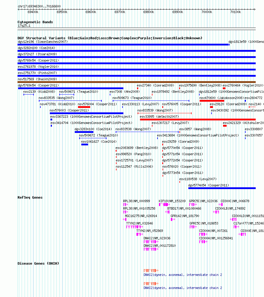 | Variant Type | CNV gain | Copy Number | | Allele State | | Allele Origin | | Probe Count | | Validation Flag | | Merged Status | S | Merged Variants | esv2751770 | Supporting Variants | | Samples | BEC_641 | Known Genes | BTBD17, C17orf77, CD300A, CD300C, CD300E, CD300LB, CD300LD, DNAI2, GPR142, GPRC5C, KIF19, MGC16275, RPL38, TTYH2 | Method | SNP array | Analysis | | Platform | Affymetrix Mapping 250K Sty2 SNP Array | Comments | | Reference | Pinto_et_al_2007 | Pubmed ID | 17911159 | Accession Number(s) | essv6983348