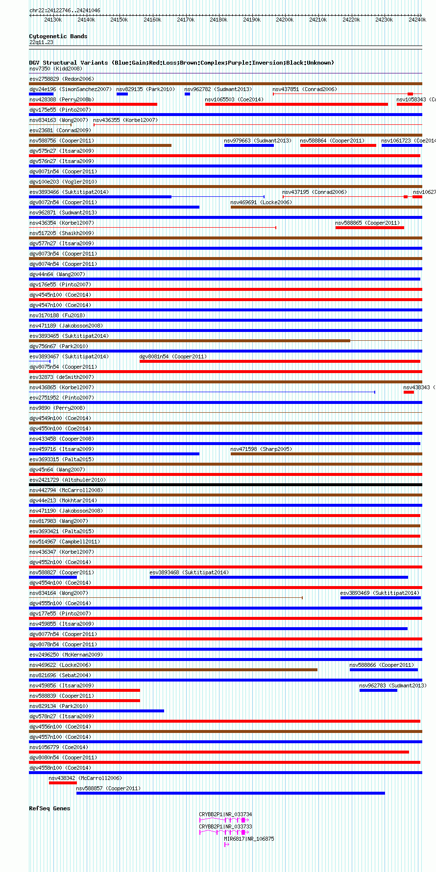 | | Variant Type | CNV loss | | Copy Number | | | Allele State | | | Allele Origin | | | Probe Count | | | Validation Flag | | | Merged Status | S | | Merged Variants | esv35068 | | Supporting Variants | | | Samples | NA19143 | | Known Genes | CRYBB2P1, MIR6817 | | Method | SNP array | | Analysis | | | Platform | Affymetrix Mapping 250K Nsp SNP Array | | Comments | | | Reference | Pinto_et_al_2007 | | Pubmed ID | 17911159 | | Accession Number(s) | essv6989208