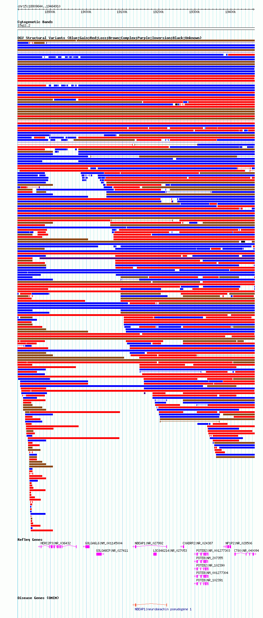 Variant DetailsVariant: essv6989729| Internal ID | 12974807 | | Landmark | | | Location Information | | | Cytoband | 15q11.1 | | Allele length | | Assembly | Allele length | | hg38 | 650546 | | hg19 | 650622 | | hg18 | 655267 | | hg17 | 655267 |